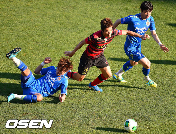 1일 오후 울산문수경기장에서 현대오일뱅크 K리그 클래식 2013 40라운드 최종전 울산 현대와 포항 스틸러스의 경기, 후반 포항 이명주가 볼을 향해 질주하고 있다.