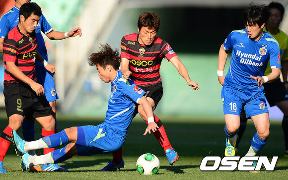 1일 오후 울산문수경기장에서 현대오일뱅크 K리그 클래식 2013 40라운드 최종전 울산 현대와 포항 스틸러스의 경기, 후반 포항 이명주가 드리블 돌파를 시도하고 있다.