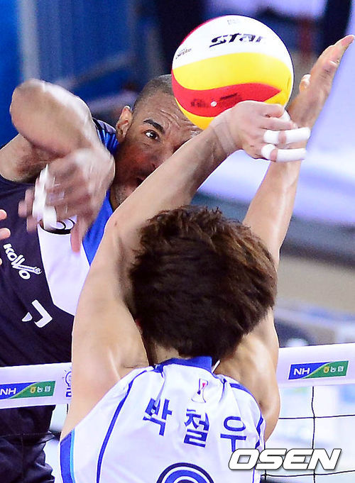 1일 오후 천안 유관순체육관에서 열린 '2013-2014 NH농협 V리그' 남자부 현대캐피탈과 삼성화재의 경기 1세트 아가메즈가 공격을 시도하고 있다.