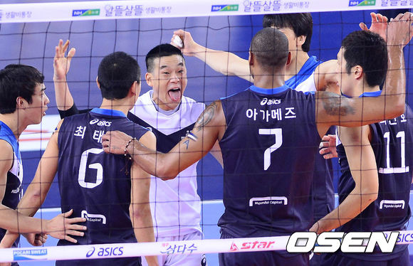 1일 오후 천안 유관순체육관에서 열린 '2013-2014 NH농협 V리그' 남자부 현대캐피탈과 삼성화재의 경기 1세트 현대캐피탈 선수들이 득점 후 기뻐하고 있다.