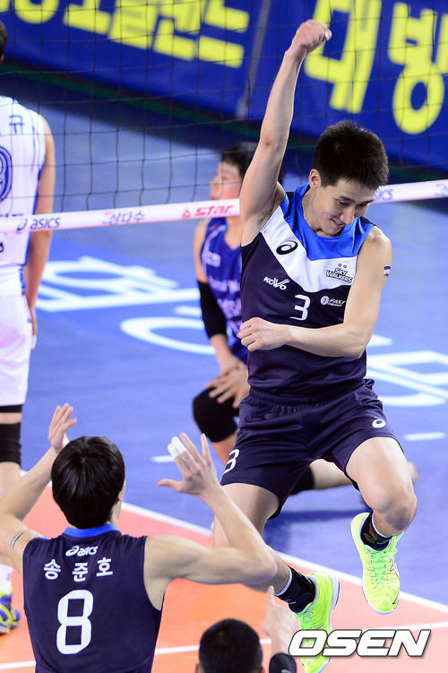 1일 오후 천안 유관순체육관에서 열린 '2013-2014 NH농협 V리그' 남자부 현대캐피탈과 삼성화재의 경기 2세트 권영민이 환호하고 있다.