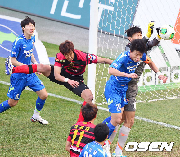 1일 오후 울산문수경기장에서 현대오일뱅크 K리그 클래식 2013 40라운드 최종전 울산 현대와 포항 스틸러스의 경기, 후반 포항 김원일이 몸을 날렸지만 울산 김승규 골키퍼가 잡아내고 있다.