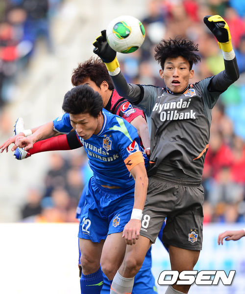 1일 오후 울산문수경기장에서 현대오일뱅크 K리그 클래식 2013 40라운드 최종전 울산 현대와 포항 스틸러스의 경기, 후반 울산 김승규가 포항의 코너킥을 막아내고 있다.
