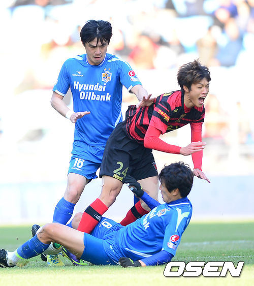 1일 오후 울산문수경기장에서 현대오일뱅크 K리그 클래식 2013 40라운드 최종전 울산 현대와 포항 스틸러스의 경기, 후반 포항 김승대가 울산 수비에 걸려 넘어지고 있다.