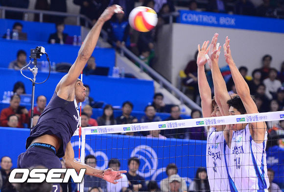 1일 오후 천안 유관순체육관에서 열린 '2013-2014 NH농협 V리그' 남자부 현대캐피탈과 삼성화재의 경기 4세트 아가메즈가 공격을 시도하고 있다.