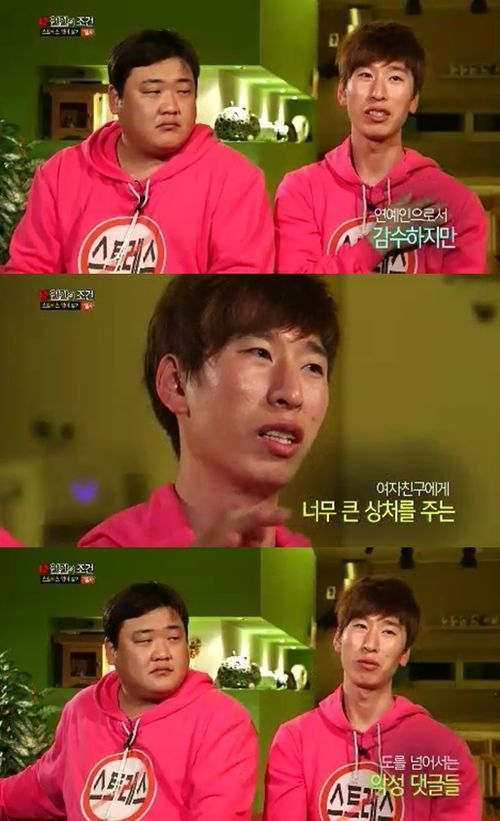 양상국은 지난달 30일 방송된 KBS 2TV 예능프로그램 '인간의 조건' 스트레스 없이 살기 미션에서 공개 연인 천이슬을 언급하며, 악플에 대한 스트레스를 호소했다. 공개 연애 이후 쏟아지는 악플에 스트레스를 받는다고 말한 그는 산에 올라 서울의 야경을 바라보며 비방용 욕설을 쏟아내는 모습으로 그간의 스트레스를 짐작케 했다.