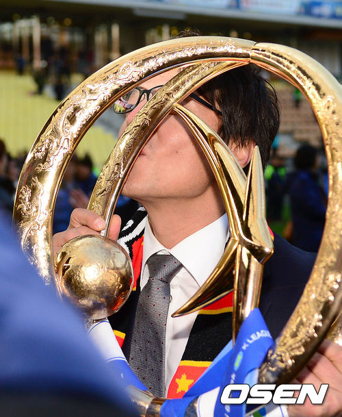 우승을 차지한 포항 황선홍 감독이 우승컵에 키스를 하고 있다. /sunday@osen.co.kr