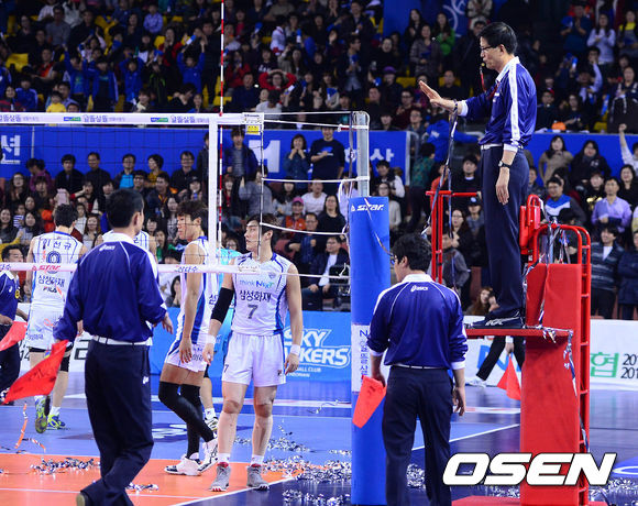 1일 오후 천안 유관순체육관에서 열린 '2013-2014 NH농협 V리그' 남자부 현대캐피탈과 삼성화재의 경기 4세트 현대캐피탈 선수들이 마지막 포인트를 차지하고 승리 자축을 하고 있는 가운데, 심판진들이 모여 터치아웃 여부를 논의 하고 있다. 오심으로 경기 결과는 현대캐피탈의 승리로 끝났다.