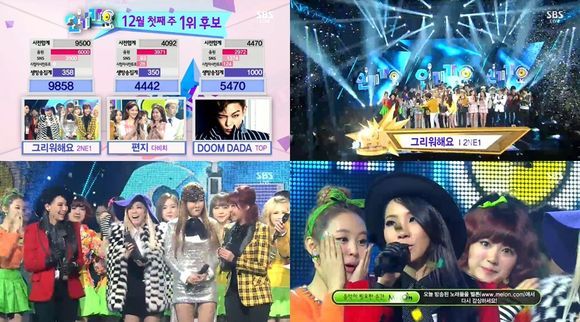 2NE1은 1일 오후 방송된 '인기가요'에서 타이틀곡 '그리워해요'로 다비치의 '편지'와 TOP의 '둠다다'를 꺾고 1위를 차지했다.