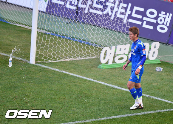 종료가 얼마 남지 않은 상태에서 울산 선수들이 볼을 차지 않고 경고를 계속 받으며 시간을 끌자 물병이 날아오고 있다. / rumi@osen.co.kr