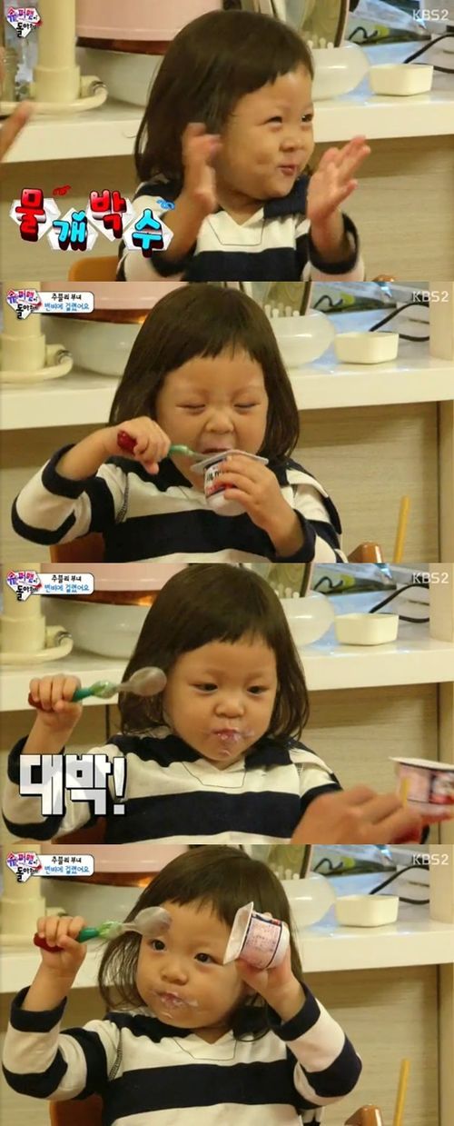 이날 요구르트를 직접 따서 가볍게 입맛을 돋운 사랑이는 아빠의 요리 우동을 흡입하는 모습으로 귀여움을 발산했다.