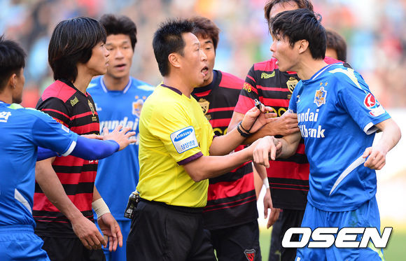 후반 울산 강민수가 포항 선수들과 신경전을 벌이고 있다. /sunday@osen.co.kr