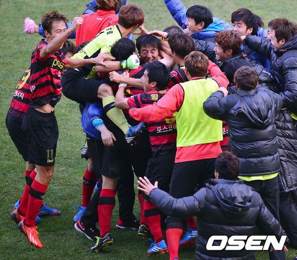 포항은 1일 오후 울산문수축구경기장서 열린 현대오일뱅크 K리그 클래식 40라운드 시즌 최종전서 종료 직전 김원일이 극적인 골을 터트리며 울산을 1-0으로 물리쳤다. 이로써 포항은 승점 74점을 기록하며 1위 울산(승점 73)을 극적으로 따돌리고 우승컵을 들어올리게 됐다.