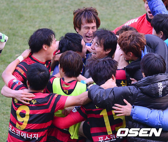 경기를 마치고 포항 황선홍 감독이 선수들과 기쁨을 나누고 있다./ rumi@osen.co.kr