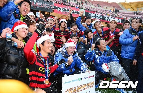 포항은 지난 2007년 이후 6년 만에 K리그 정상의 기쁨을 누렸다. 1986년, 1988년, 1992년, 2007년에 이어 통산 5번째 우승의 금자탑을 쌓았다. 더블의 꿈도 이뤘다. 지난달 전북 현대를 물리치고 FA컵 2연패를 달성한 데 이어 K리그 왕좌를 차지했다. K리그 30년 역사상 리그와 FA컵을 제패한 팀은 포항이 최초다.