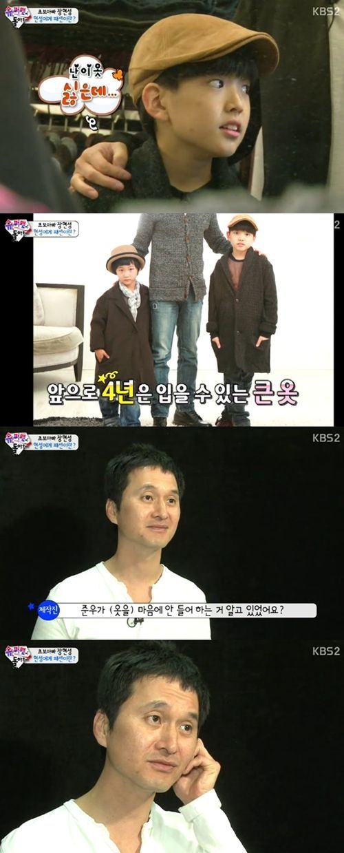하지만 장현성은 시종일관 즐거워했고 아이들과 사진까지 찍었다. 사진 속 준우와 준서는 앞으로 몇 년은 더 입을 수 있는 큰 옷에 파묻혀 어색한 미소를 짓고 있어 웃음을 자아냈다.