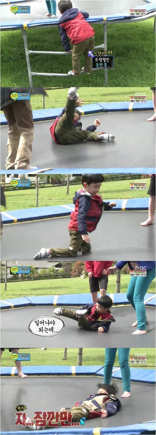 형들과 누나들이 쉽게 트램펄린에 오른 것과 달리 김민율은 쉽지 않았다. 짧은 다리 탓에 계단을 오르지 못했고, 결국 형과 누나의 도움으로 질질 끌려왔다.