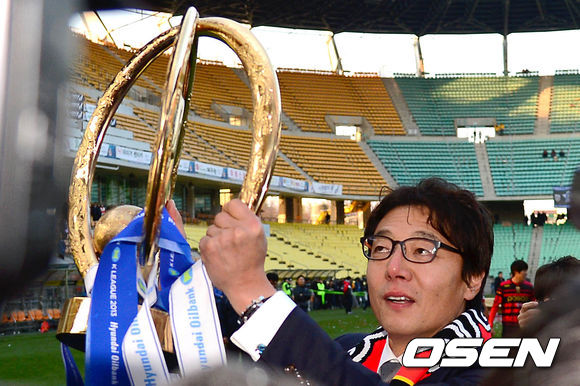우승을 차지한 포항 황선홍 감독이 우승컵을 들어올리고 있다. /sunday@osen.co.kr