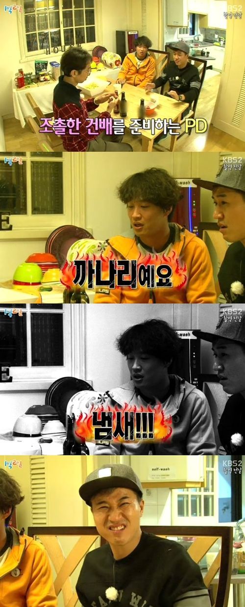 하지만 차태현과 김종민은 처음부터 유 PD에 당하는 모습을 보였다. 유 PD가 조촐한 건배를 하자며 건넨 까나리가 담긴 맥주를 자연스럽게 받아 마시는 허술한 면모를 보였던 것. 차태현은 "내가 병을 직접 땄다"라고 흥분했지만 이는 유PD의 속임수였다.