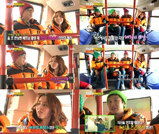 이날 '올킬 플라잉체어'를 통해 짝인 된 이승기와 이광수는 유재석-한혜진 커플과 함께 버스를 타고 미션 장소로 이동했다. 그러던 중 유재석은 한혜진이 지난 2월 '런닝맨'에 출연했을 당시 기성용 선수와 비밀연애 중이었다고 말했다.