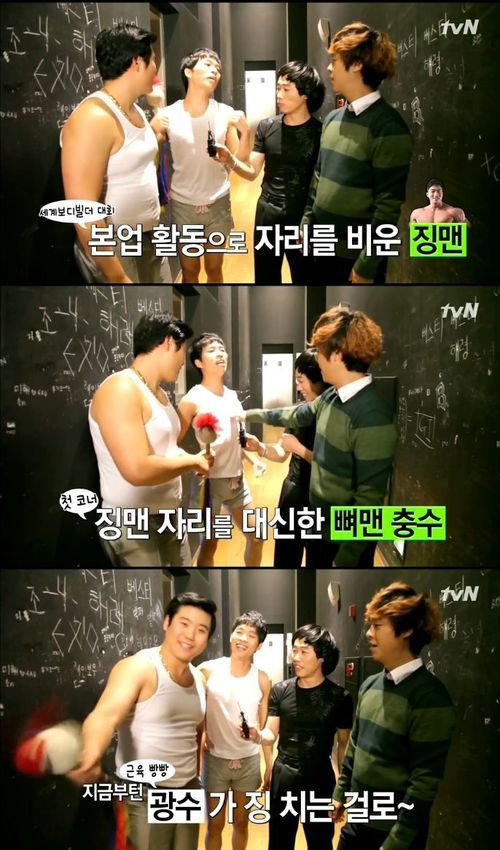 이에 '생계형 건달' 에 출연하는 문규박, 정만호, 미키광수 등과 함께 '생계형 건달' 코너 종료 후 등장한 박충수는 "징맨이 세계보디빌더 대회에 나가느라 뼈맨으로 나왔다"라고 소개했다.