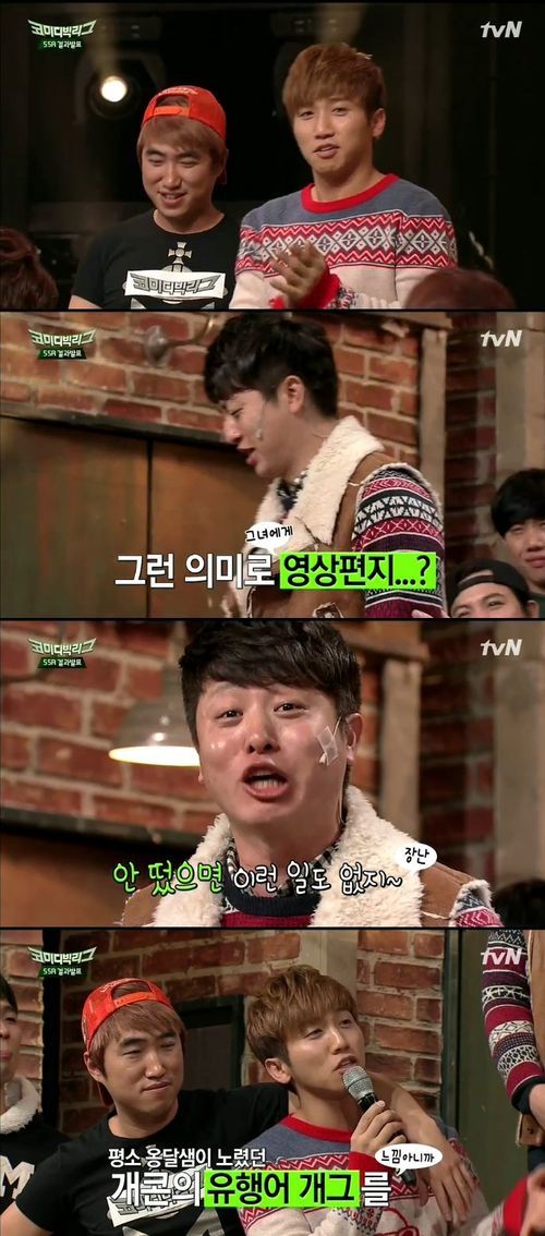 유상무는 1일 오후 방송된 tvN '코미디빅리그'에서 유세윤-장동민과 함께 꾸민 '옹달샘 마술단'이 첫 1위를 하자 유세윤의 강권에 의해 영상 편지를 찍었다.
