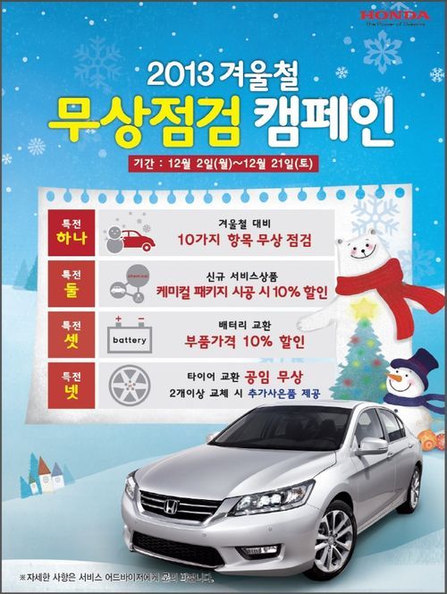 혼다코리아가 본격적인 겨울철을 앞두고 2일부터 12월 21일까지 차량 무상 점검 캠페인을 실시한다고 밝혔다.