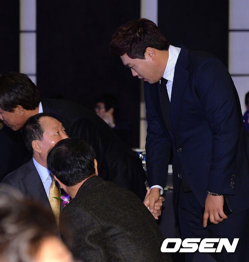 특별상 수상을 앞둔 류현진이 김인식 KBO 위원장과 인사를 나누고 있다.