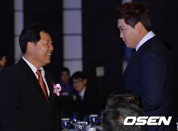 특별상 수상을 앞둔 류현진이 이만수 SK 감독과 인사를 나누고 있다.