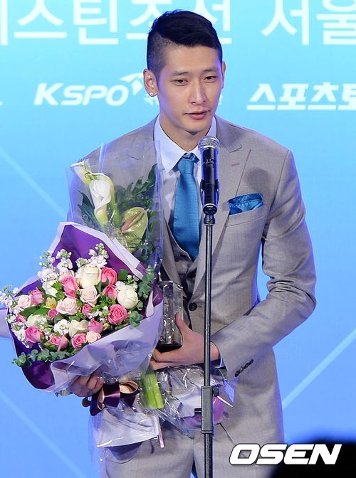 남자프로배구 올해의 선수상을 수상한 현대캐피탈 문성민이 수상소감을 전하고 있다.