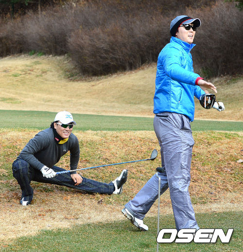 삼성 이승엽, 배영수가 티샷에 앞서 몸을 풀고 있다.