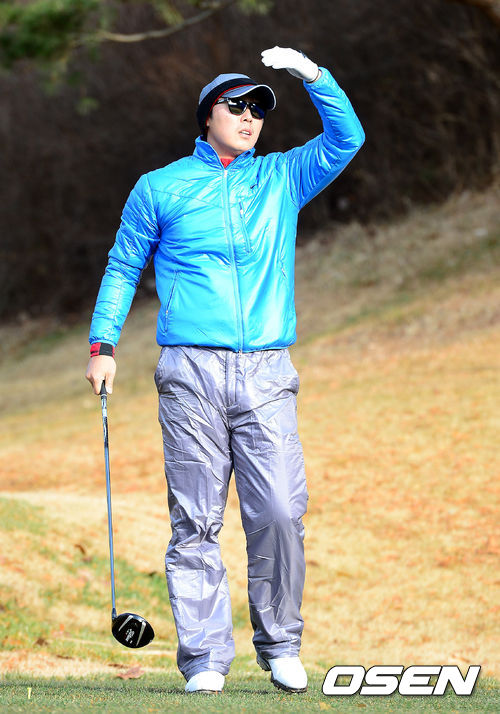 삼성 이승엽이 티샷을 날리고 볼을 바라보고 있다.