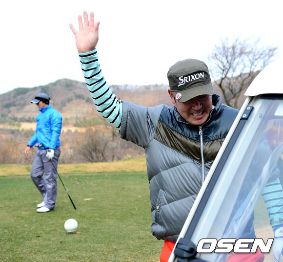 삼성 진갑용이 배영수의 티샷을 바라보고 손을 흔들며 장난을 치고 있다.