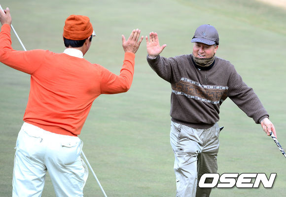 NC 김경문 감독이 퍼팅에 성공하고 하이파이브를 하고 있다.