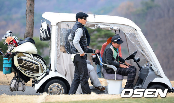 넥센 염경엽 감독이 카드에서 내려 티샷 준비를 하고 있다.