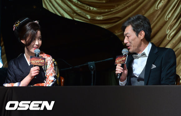 2일 오후 서울 강남구 역삼동 라움 마제스틱볼룸에서 열린 KBS 2TV 새 수목드라마 '감격시대:투신의 탄생'의 쇼케이스에서 임수향이 김갑수와 얘기를 나누고 있다.