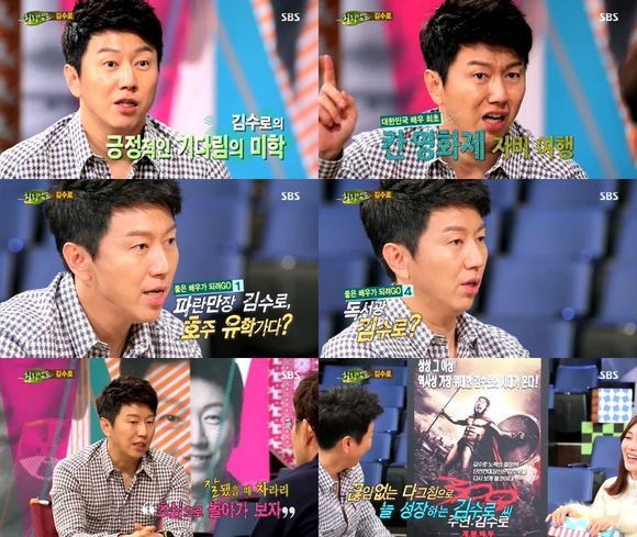 김수로는 지난 2일 오후 방송된 SBS 예능프로그램 '힐링캠프-기쁘지 아니한가(이하 '힐링캠프')'에서 긍정적인 기다림의 철학이라든지, 좋은 배우가 되기 위해 긍정 하나로 노력하는 모습 등 경험에서 우러나온 가치관으로 보는 이들의 시선을 사로잡았다.