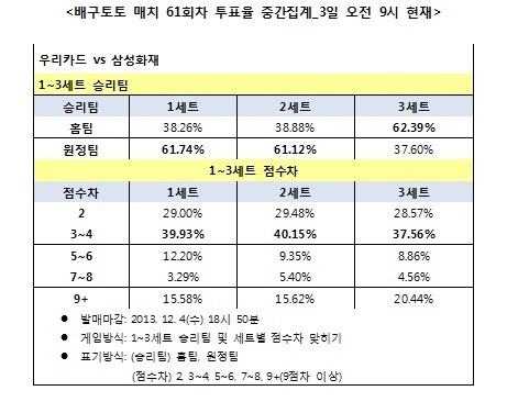 국민체육진흥공단(www.kspo.or.kr)이 발행하는 체육진흥투표권 수탁사업자인 스포츠토토의 공식 온라인 발매사이트 베트맨(www.betman.co.kr)은 오는 4일(수) 열리는 2013-2014시즌 V-리그 우리카드-삼성화재전을 대상으로 하는 배구토토 매치 61회차 게임 투표율 중간집계 결과, 배구팬들은 삼성화재가 우리카드를 상대로 우세한 경기를 펼칠 것으로 예상했다.