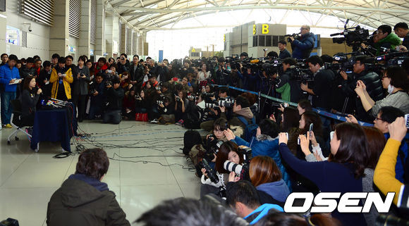 출국에 앞서 김연아가 취재진과 인터뷰를 하고 있다.