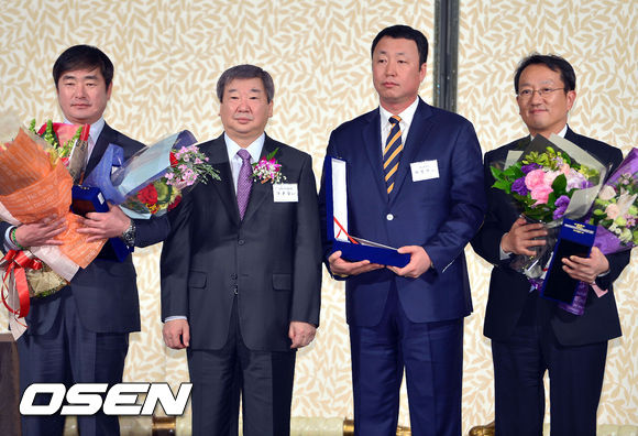 3일 오전 서울 소공동 플라자호텔에서 진행된 '2103 조야제약 프로야구 대상' 시상식에서 프로감독상 류중일 감독과 프로코치상 차명석 코치, 프런트상 NC 다이노스 이태일 사장이
