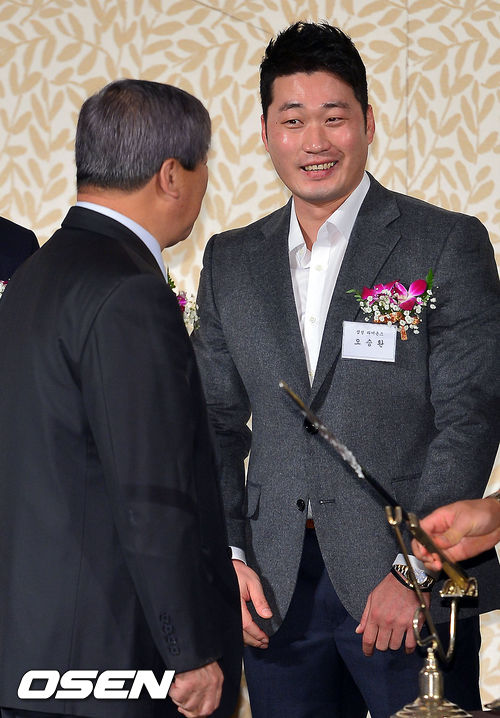 3일 오전 서울 소공동 플라자호텔에서 진행된 '2103 조야제약 프로야구 대상' 시상식에서 구원투수상을 받은 오승환이 KBO 구본능 총재와 이야기를 나누고 있다.