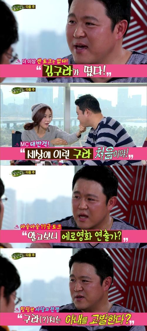 김구라는 "무지하게 덥네", "집사람이 (돈을)다 썼다. 우리 이혼 위기에 놓여있다"는 우스갯소리로 MC들을 폭소케 만들었다. 평소 직설적인 입담을 자랑해온 김구라가 어떤 강도의 입담으로 '힐링캠프'를 휘어잡을지 기대를 자아낸다.