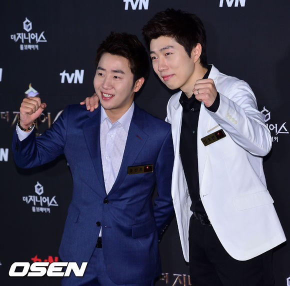 3일 오후 tvN '더 지니어스 시즌2: 룰 브레이커'(이하 더 지니어스2) 시사회 및 기자간담회가 서울 마포구 성산동 상암 CGV 8관에서 열렸다.홍지호와 임요환이 포토타임을 갖고 있다.