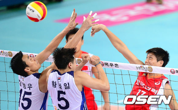 3일 오후 인천계양체육관에서 열린 '2013-2014 NH농협 V리그' 남자부 대한항공과 한국전력의 경기 1세트 한국전력 하경민이 대한항공 김형우, 황동일의 블로킹을 피해 득점을 올리고 있다.
