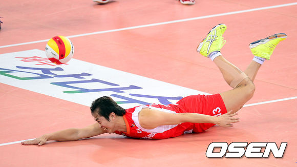 3일 오후 인천계양체육관에서 열린 '2013-2014 NH농협 V리그' 남자부 대한항공과 한국전력의 경기 1세트 한국전력 김정석이 몸을 날려 공을 살려내고 있다.