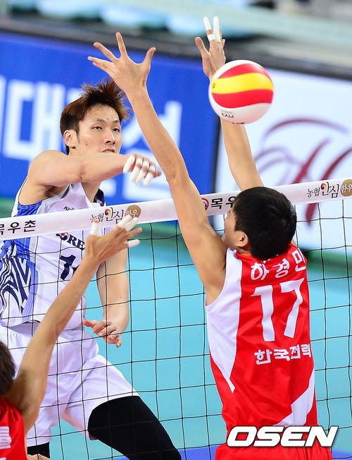 3일 오후 인천계양체육관에서 열린 '2013-2014 NH농협 V리그' 남자부 대한항공과 한국전력의 경기 1세트 대한항공 진상헌이 직선타 공격을 시도하고 있다.