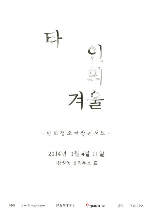 2014년 1월 4일과 11일 오후 7시, 삼성동 올림푸스홀에서 개최되는 한희정의 첫 소극장 콘서트 '타인의 겨울'은 오는 12월 6일 오후 5시 인터파크에서 티켓이 오픈된다.