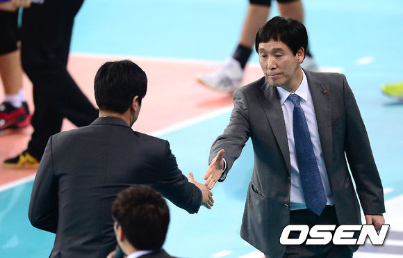 승리를 거둔 한국전력 신영철 감독이 대한한공 김종민 감독과 악수를 나누고 있다./youngrae@osen.co.kr