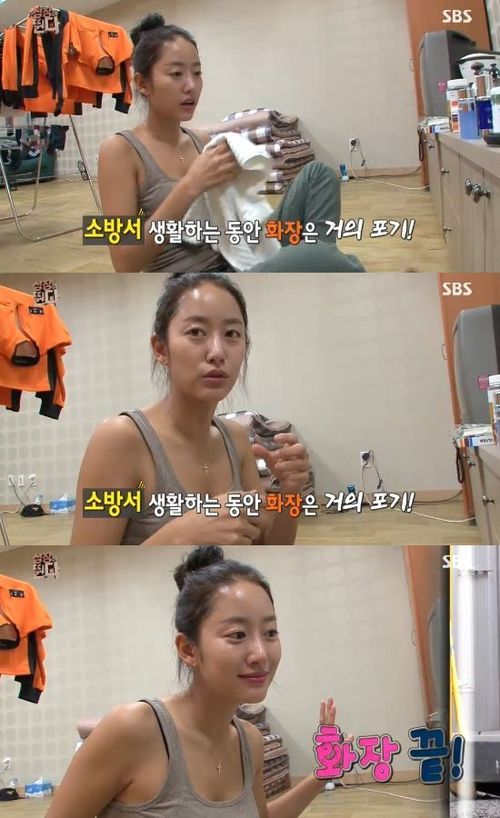 그리고 그는 세수 후 제작진에게 화장품 꾸러미를 공개했다. 여배우치고 굉장히 간소한 구성물이 눈길을 끌었다. 그는 "땀이 나고 얼굴에 이것 저것 쓰기 때문에 화장을 하지 않는 게 낫다"며 1000원짜리 립스틱만을 바른 채 모든 준비를 마쳤다.