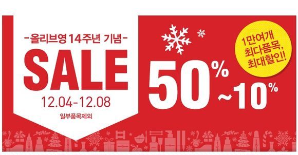 12월 4일부터 8일까지 펼쳐지는 ‘빅1’ 이벤트에서는 1만여 개의 품목을 최대 50%까지 할인 판매한다. CJ 올리브영은 홈페이지 공지를 통해 “1만여 개 최대품목을 최대할인 한다”고 알렸다.